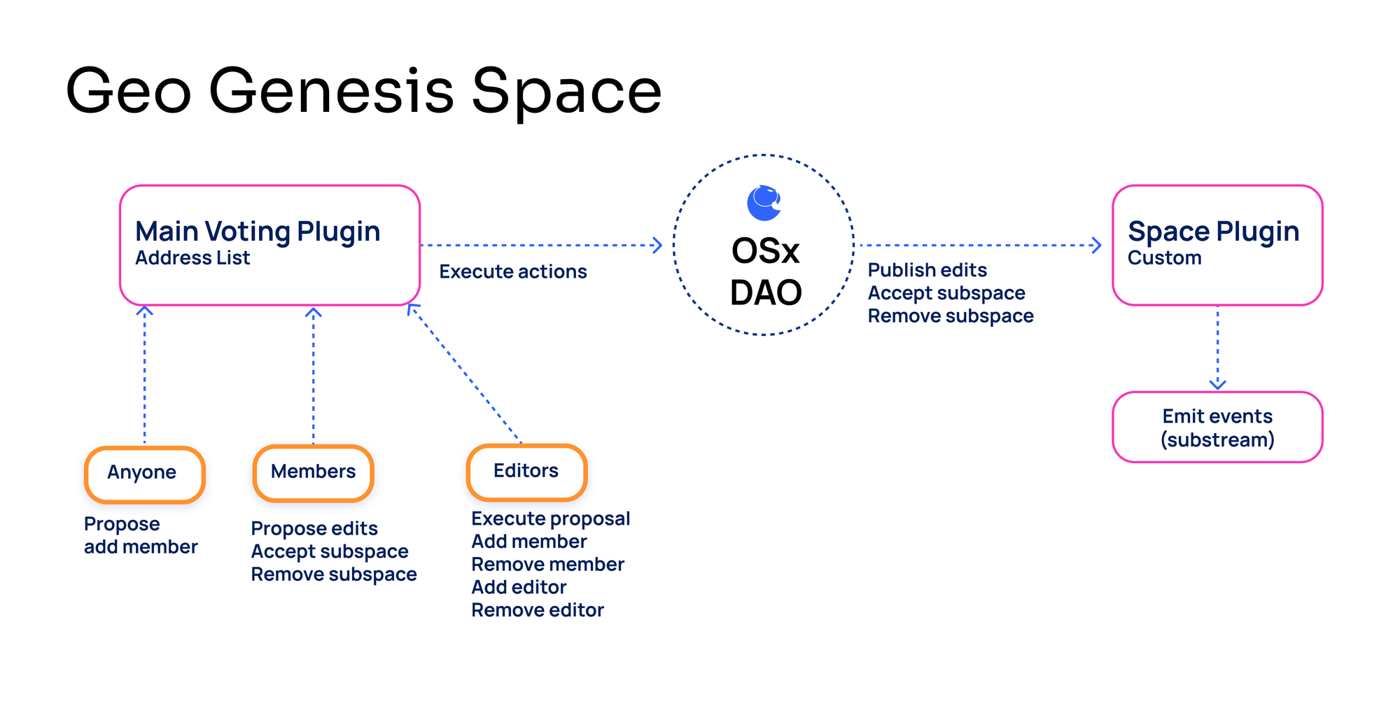Each Space in Geo Genesis operates as an Aragon DAO with a custom governance plugin. The DAO contract holds the editing permissions of the Space, while the plugin contains custom governance logic that dictates how the information in the Space is governed.