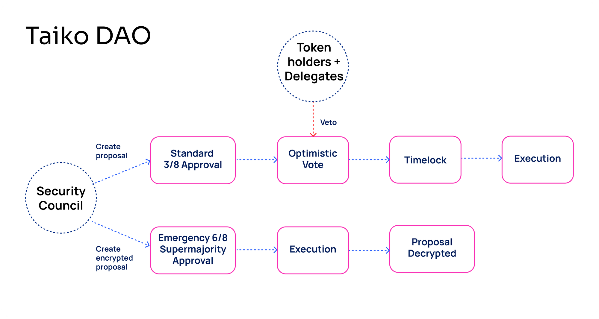Taiko is using optimistic governance which enables a streamlined decision-making process that balances efficiency with community checks and balances. This design allows the Security Council to pass proposals, while giving token holders onchain veto rights. This means token holders can veto a malicious proposal and/or have the opportunity to exit. If a proposal doesn’t accumulate enough votes by the end of the veto period, it is automatically executed after an additional 7-day timelock. Giving token holders onchain veto rights and an opportunity to exit serves as both checks and balances and an additional security layer. It also combats voter fatigue, as voters only need to participate when a veto is needed.