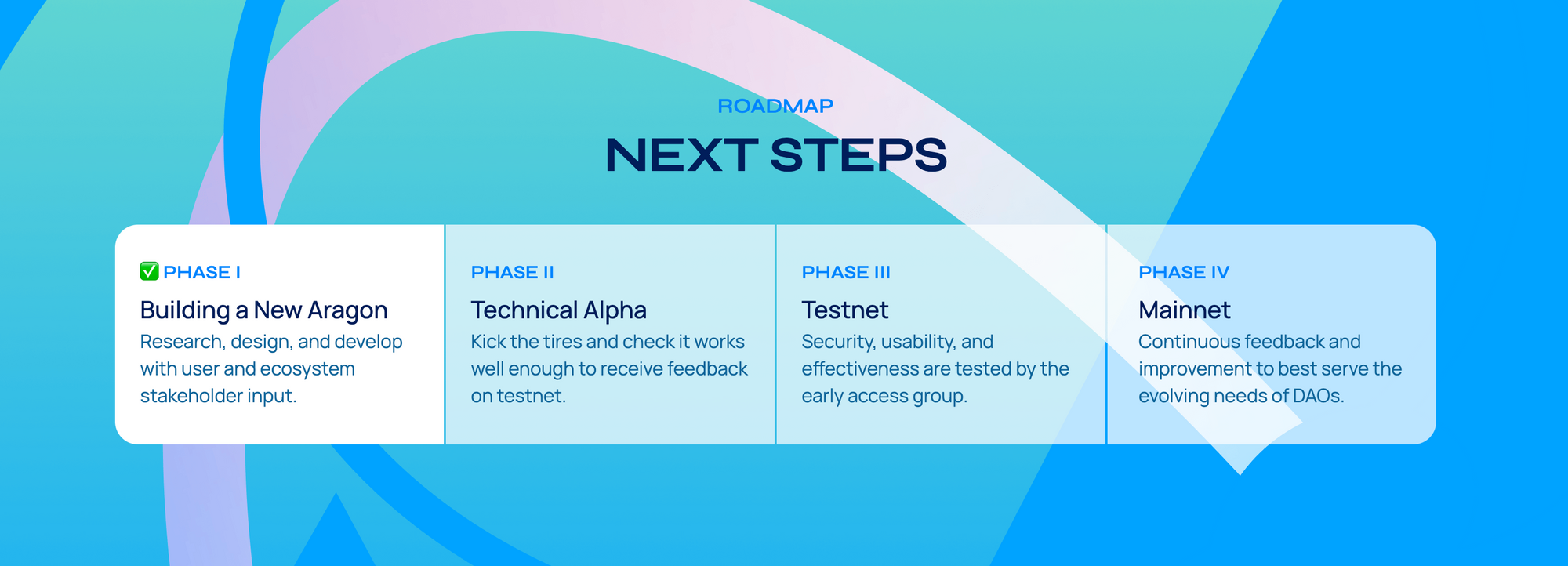 - Build the new Aragon together, in continuous conversation with you. Our work in progress is open (GitHub repos for smart contracts, SDK, app UI), and you can sign up for the early access waitlist to be notified as soon as we have the first version in an acceptable state for you to try out.
