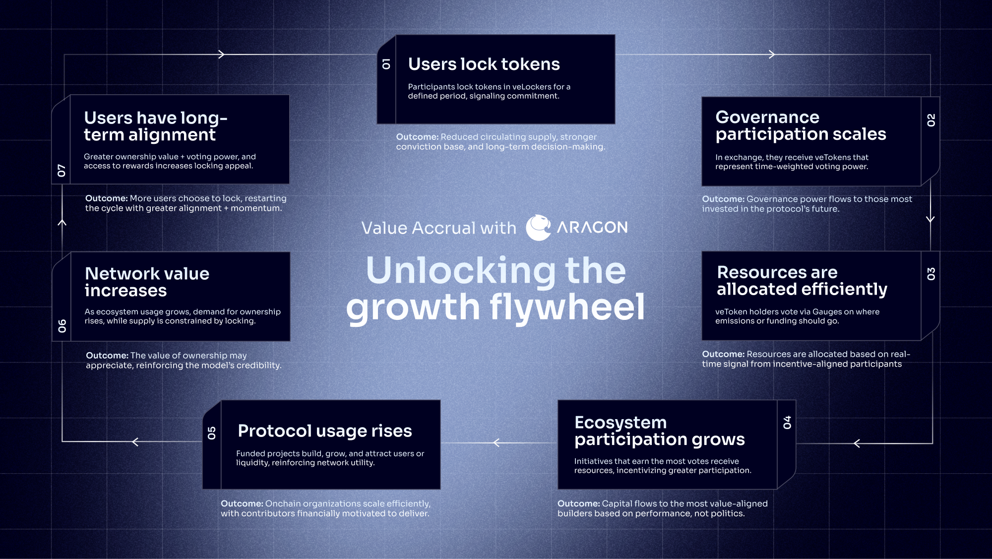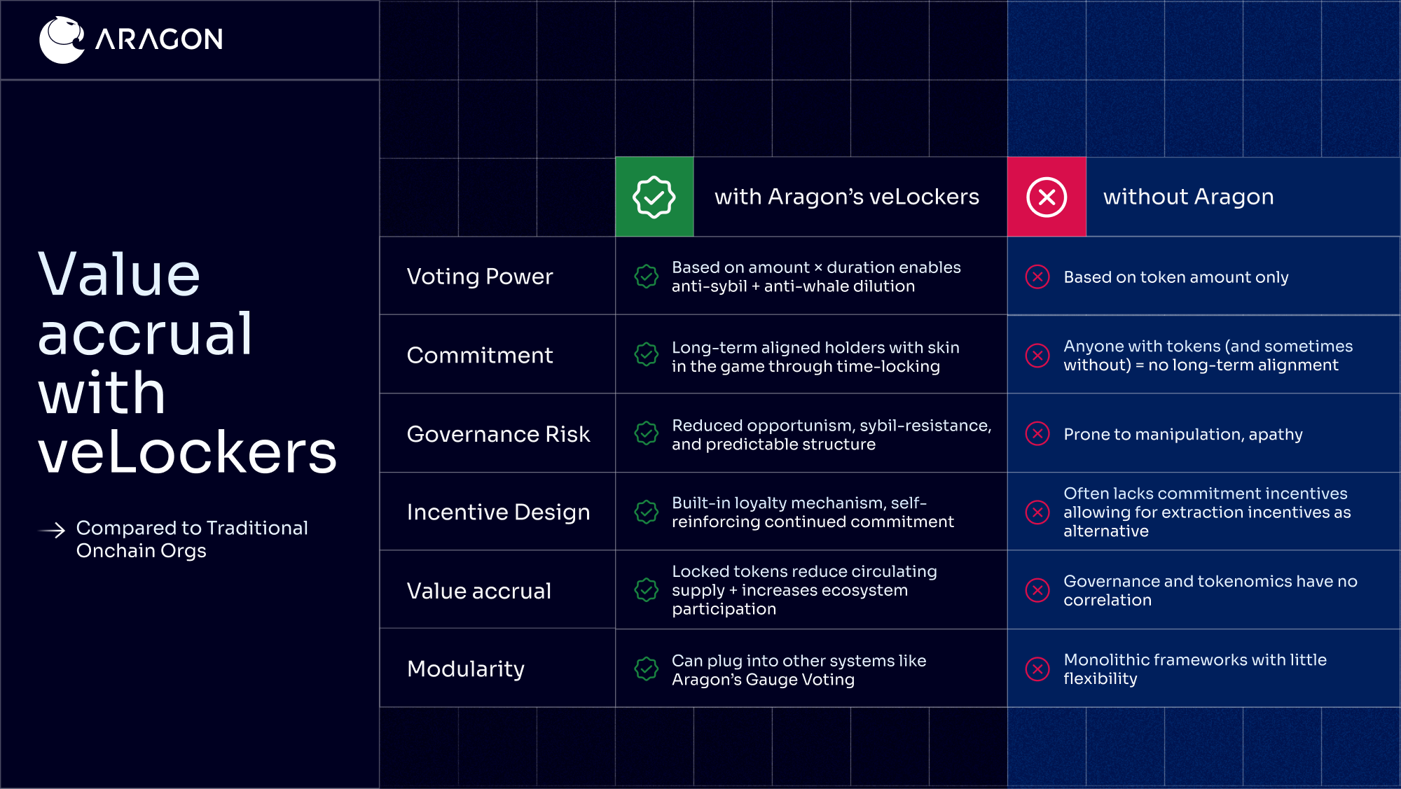 Aragon’s veLocker + Gauge primitives, part of the Value Accrual Toolkit, are designed to close that gap. They don’t just make onchain organizations more democratic, they make them more productive. By combining commitment-based voting with incentive-directed capital allocation, Aragon transforms governance and onchain management from a decision-making layer into a value-generating flywheel unlocking true onchain ownership.