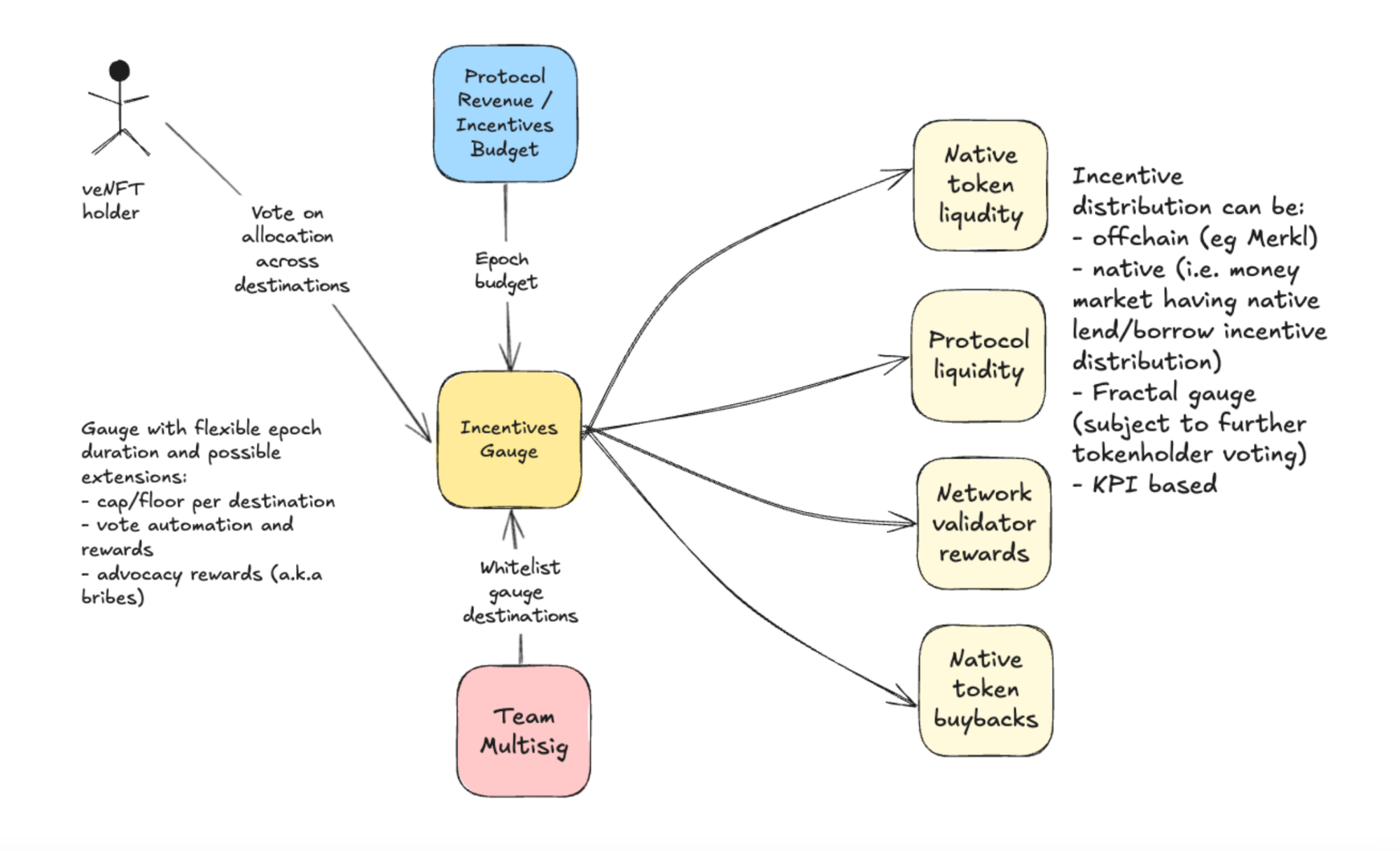 - Fractional Gauges: Incentives from high level gauges can flow into smaller, purpose-specific sub-gauges where further fine tuning of targeted incentivisation can occur. This allows protocols to implement complex, multi-layered tokenomics structures while maintaining coherence.