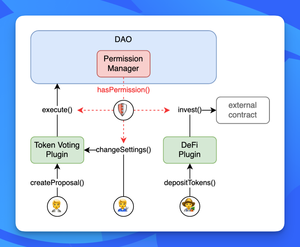 - Permissions: govern interactions between the plugins, DAOs, and any other address. The permissions grant or revoke the ability of plugins to execute actions on behalf of and within the DAO.