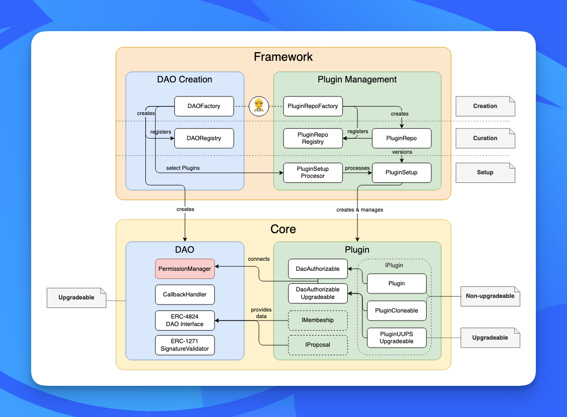 2. Framework contracts: which are in charge of creating and registering each deployed DAO or plugin.
