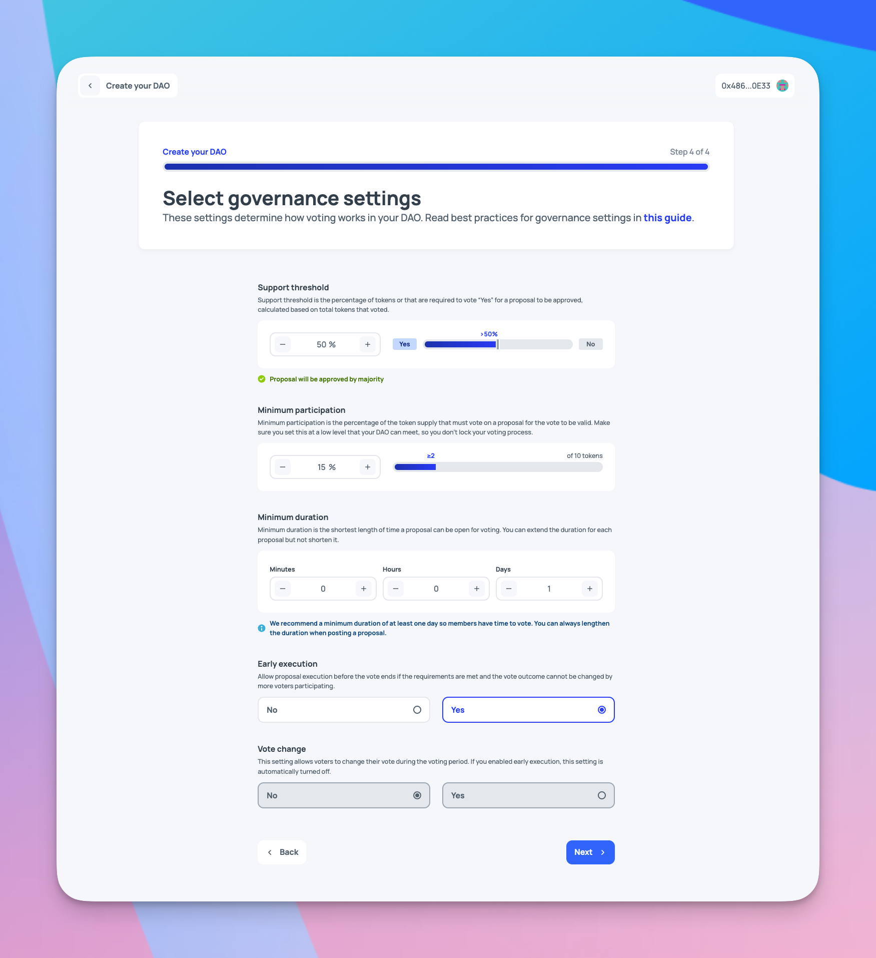 We embedded education into the experience with links to guides and tool tips that help you make important decisions, such as how to set governance parameters for your DAO. We also provided more descriptive error messages, details about the steps you're taking, and explanations about why they're important. This makes participating in your DAO more secure, because you understand what exactly you are doing onchain.